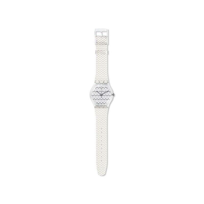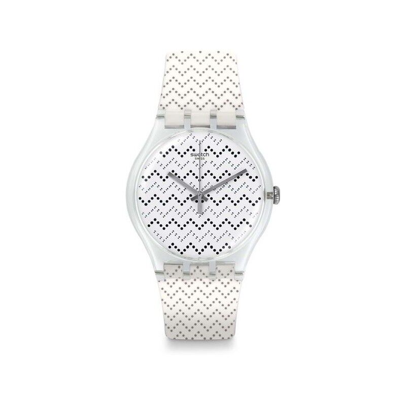 ¡Comienza una ondulación, se crea una ola! WAVEY DOTS (SUOK11) está diseñado con un dial blanco que brilla con un patrón imitación de piedras preciosas y una impresión de color gris oscuro. Es sutil y hermosa, con un estuche transparente y banda de impresión gris.