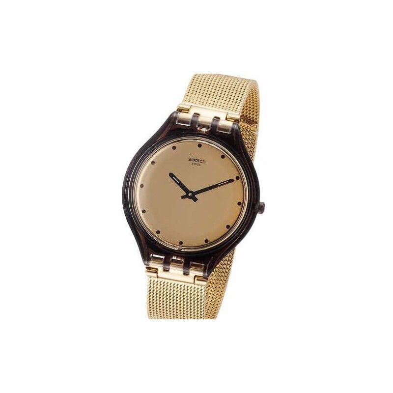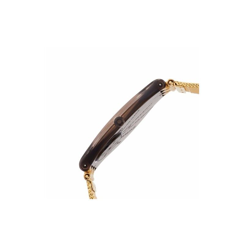 Reloj ultra delgado, se compone de un dial plateado con impresiones blancas y agujas superluminava de color dorado. Su caja se divide a lo largo de una línea curva que marca su parte trasera de color blanco. El modelo se completa con una correa ajustable de malla milanesa de acero inoxidable.