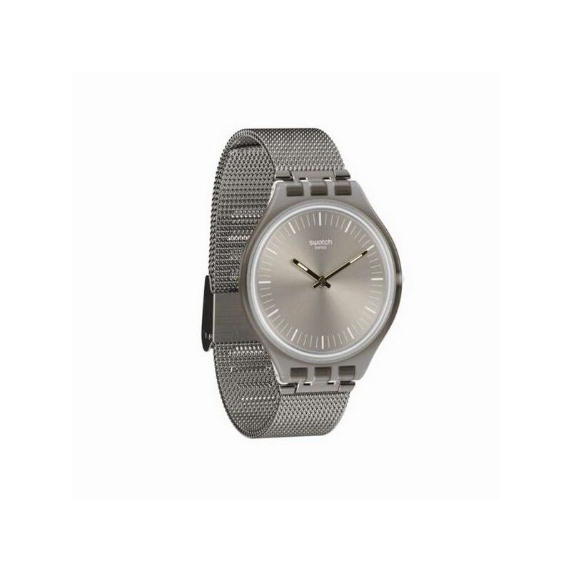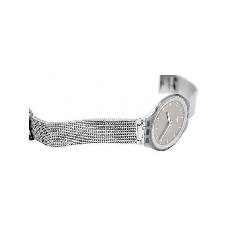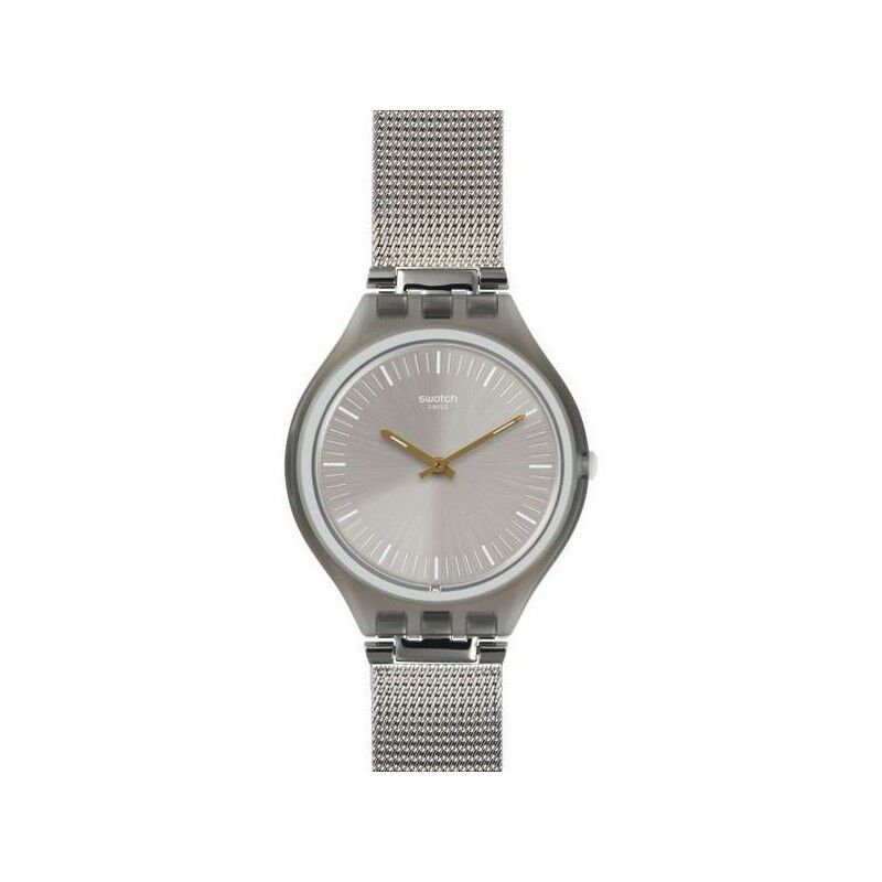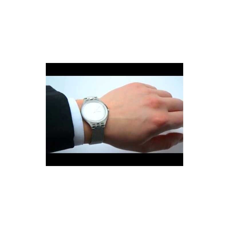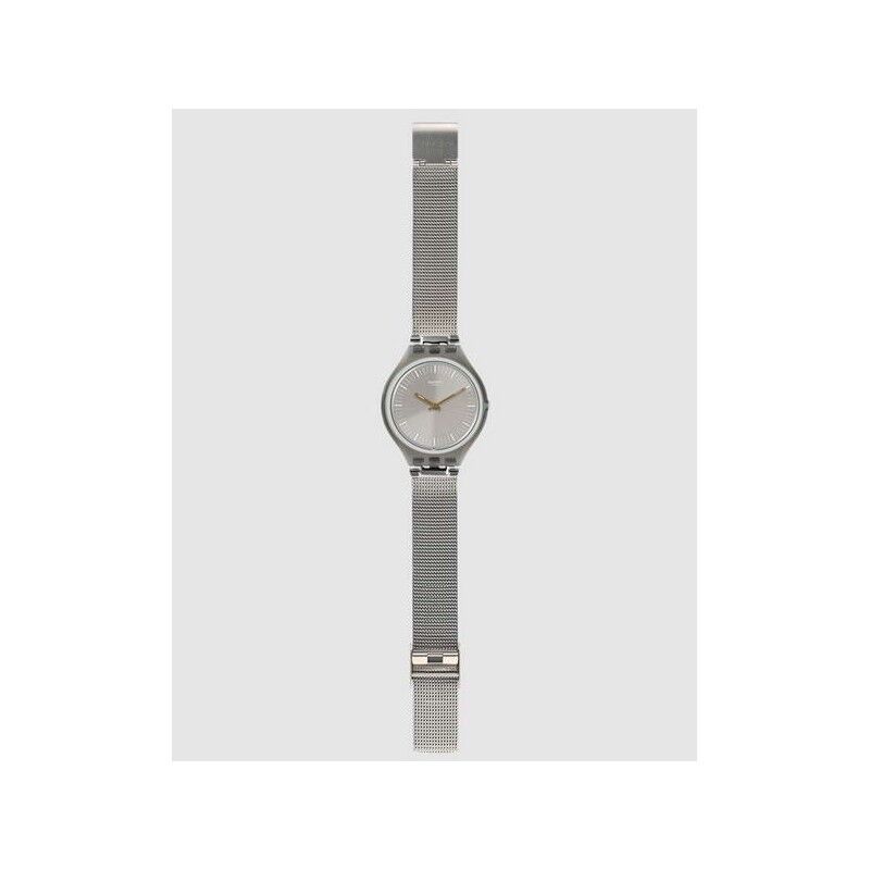 Reloj ultra delgado, se compone de un dial plateado con impresiones blancas y agujas superluminava de color dorado. Su caja se divide a lo largo de una línea curva que marca su parte trasera de color blanco. El modelo se completa con una correa ajustable de malla milanesa de acero inoxidable.
