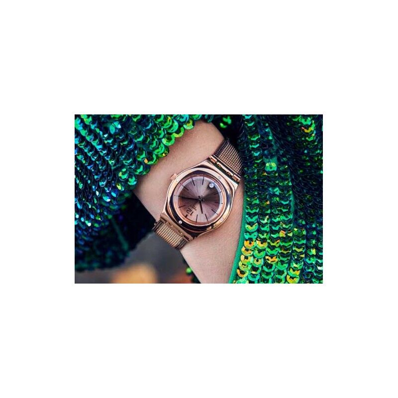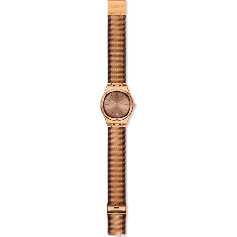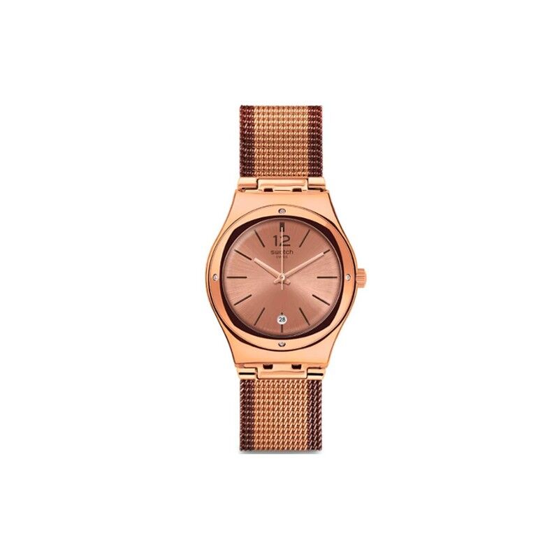 El Reloj Swatch FULL ROSE JACKET (YLG408M) es una explosión de glamour dorado en tu muñeca. El brazalete Milanese en PDV oro rosado viene con bordes de PVD en color café y el bisel destaca por sus cuatro cristales transparentes